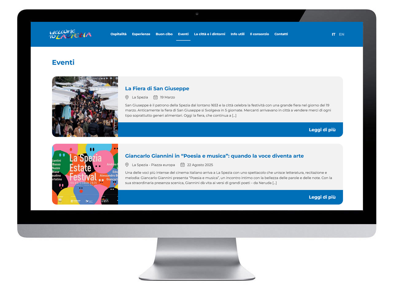 Siamo riusciti a coniugare una struttura solida con una grafica coinvolgente e curata. Oggi gli associati di Welcome La Spezia possono aggiornare con facilità contenuti e sezioni dedicate, mantenendo il sito sempre ricco e attuale. L’integrazione dinamica alimenta automaticamente la home page, mentre l’impianto visivo colorato ed elegante rende la navigazione fluida, moderna e intuitiva.